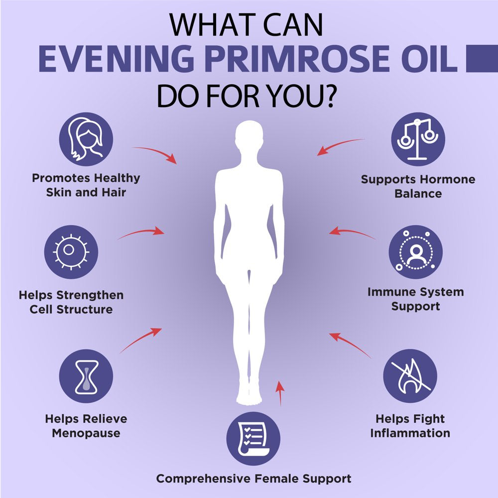 - HORMONAL BALANCE & FEMALE SUPPORT – Evening Primrose Oil can help support hormone balance in women. Primrose oil also supports other aspects of female health and is commonly used for PMS relief, menopause relief, hot flashes, menstrual discomfort, and even breast pain.