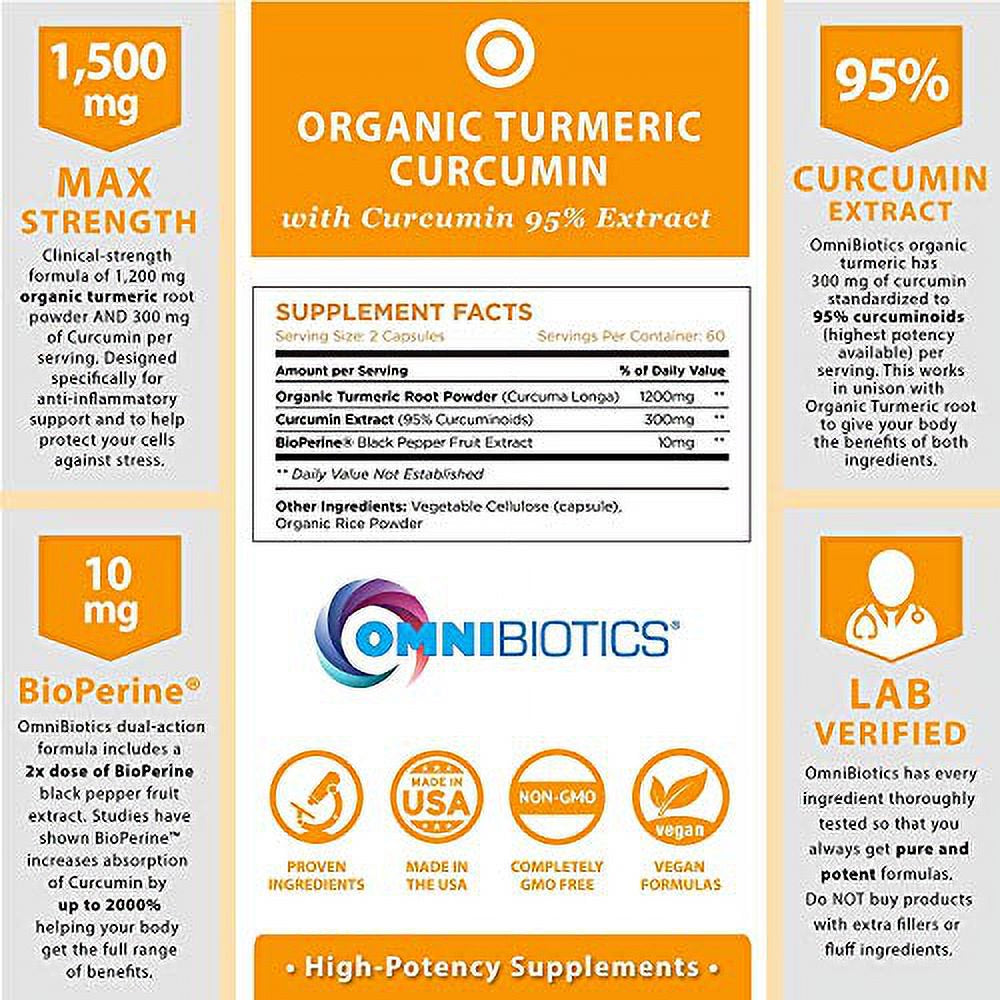 Organic Turmeric Curcumin Supplement 1500Mg with Bioperine | 95% Standardized Curcuminoid Extract & Organic Root Powder with Piperine Black Pepper Fruit (10Mg), 120 Vegetarian Capsules