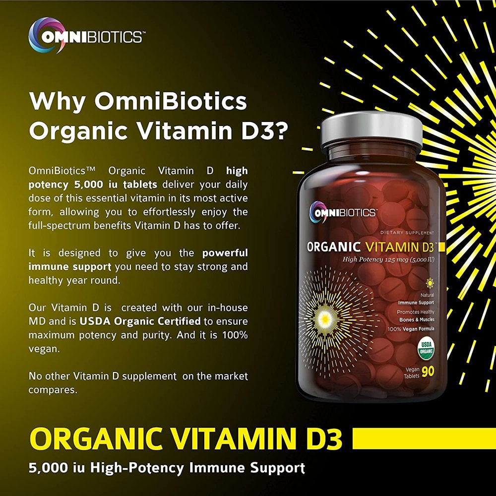 HIGH POTENCY FORMULA –Studies have proven that up to 75% of Americans are deficient in Vitamin D. OmniBiotics offers a Certified Organic Vitamin D3 supplement which contains 5000 IU per tablet. This maximum potency formula is designed to give you the support your body needs.