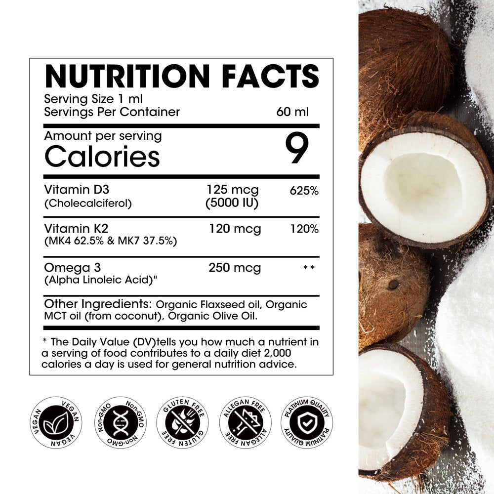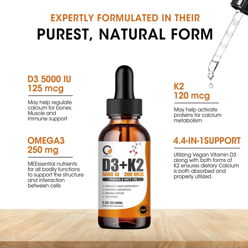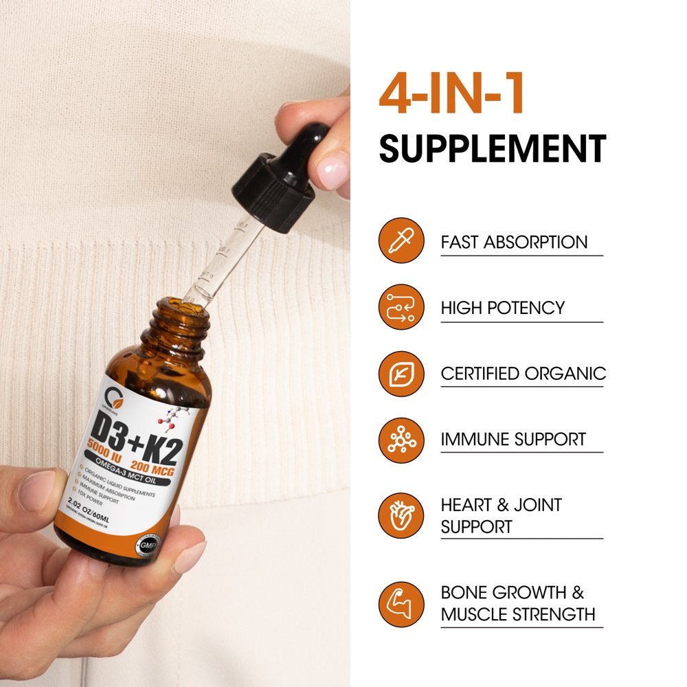 Orgeuos Vitamin D3 K2 Liquid Drops 5000 IU, with MCT Oil Omega 3, Max Strength for Bone & Teeth Strength, Immune & Heart Health, 4-In-1 Complex Formula - Unflavored, 2 FL Oz