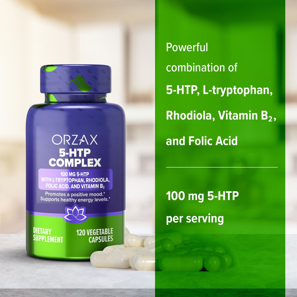ORZAX 5-HTP with L-Tryptophan & Rhodiola, Support Mood & Stress Management, 120 Vegetable Capsules