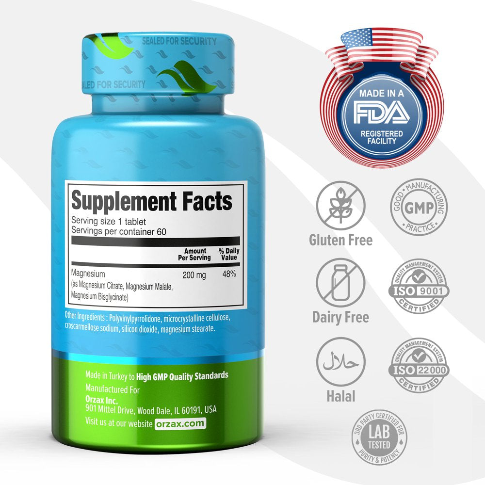 ORZAX Magnesium Complex, High Absorption, 200 Mg Triple Mag Glycinate, Malate & Citrate, Gluten & Dairy Free, 60 Tablets