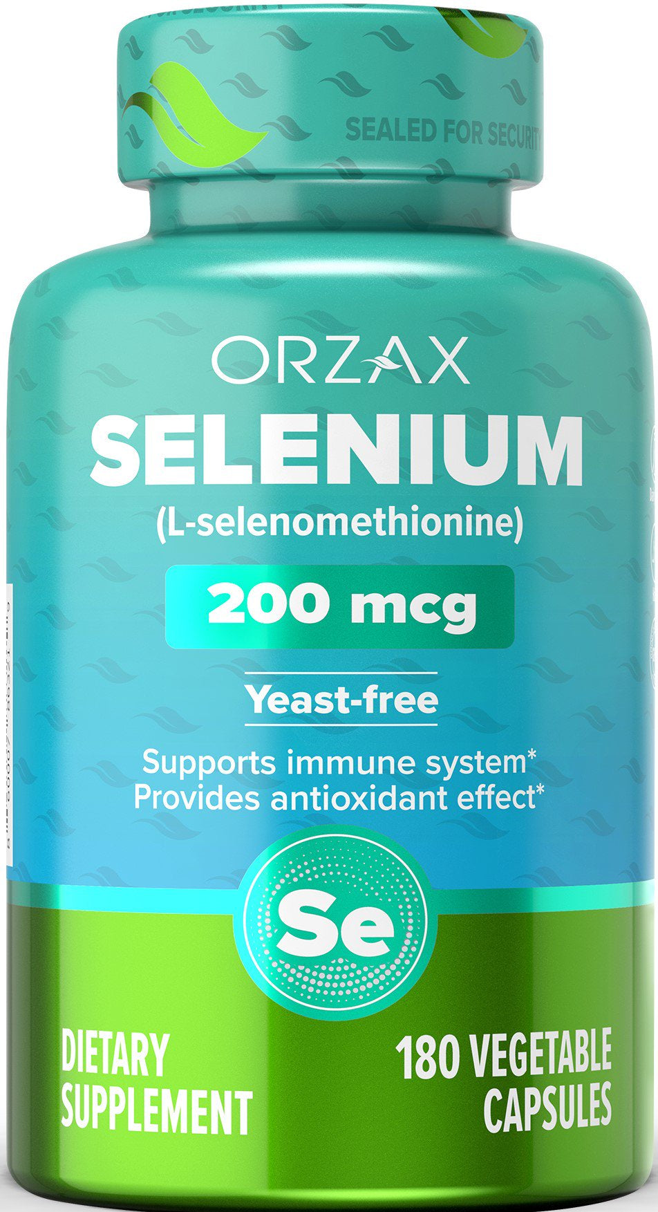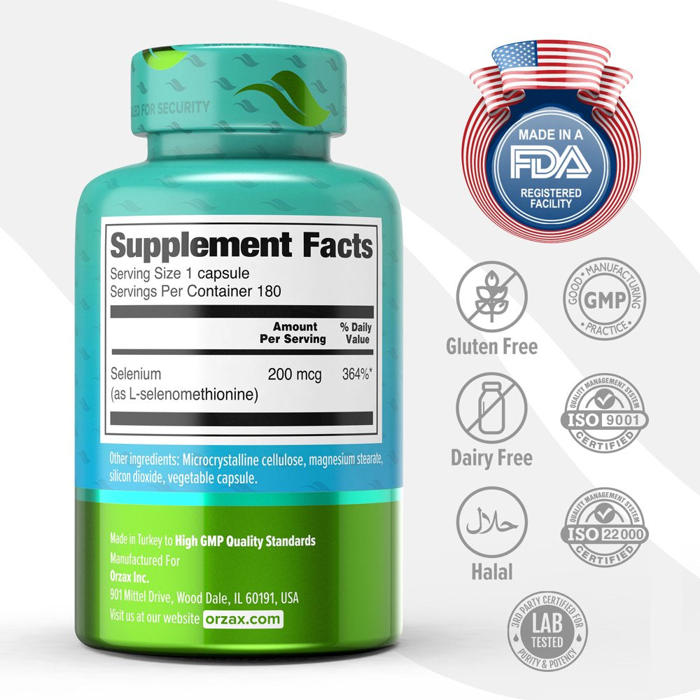 Over 17 years of experiment, ORZAX is a GMP and FDA-approved facility to provide high-quality services to customers. Selenium is an important mineral for human life for years. Main benefits of selenium are antioxidant effect and immune support. Also another benefits of selenium is help support healthy thyroid function. Orzax Selenium supplement contains 180 capsules and provides 200 mcg selenium per capsule