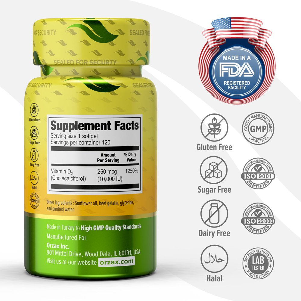 ORZAX Vitamin D3 10000 Iu, 120 Days Supply, 125 Mcg Vitamin D3 Mini Softgel, 120 Count