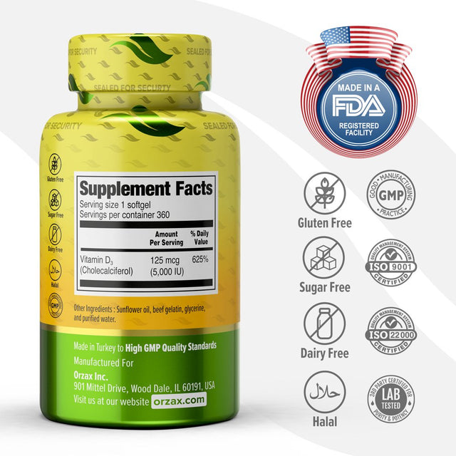 ORZAX Vitamin D3 5000 Iu, 360 Days Supply, 125 Mcg Vitamin D3 Mini Softgel, 360 Count