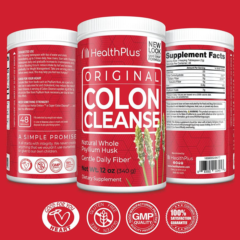 Each serving supplies 24% daily value of fiber Maintains a healthy heart Naturally absorbs toxins in the colon Cleanses the lining of the intestine All natural , No fillers or binders Health Plus The Original Colon Cleanse Plain Description: Colon Cleanse has been the number 1 product in its class for over 3 decades. Each serving supplies 24% daily value of fiber Maintains a healthy heart Doctor Recommended Naturally absorbs toxins in the colon Cleanses the lining of the intestine Mixes well with water or juice Maintains regularity All natural No fillers or binders Enjoy the benefits of Colon Cleanse, made from 100% Psyllium Husk! Psyllium husk is a soluble fiber. Soluble fiber reacts by absorbing water in the intestine, creating a gel substance. During this reaction Colon Cleanse aids in: a healthy digestive system, heart health, weight management, regularity, and detoxification of the colon. The body's first line of defense is a healthy colon. However, our internal detoxification process can break down from: overexposure to environmental pollutants in our air, food and water, poor diet, lack of adequate fiber, excessive alcohol and caffeine, high stress, lack of exercise, overuse of anti-biotics and prescription medications. These produce a state of toxicity and COLON CLEANSE then becomes one of the most important steps in detoxification. Disclaimer These statements have not been evaluated by the FDA. These products are not intended to diagnose, treat, cure, or prevent any disease.