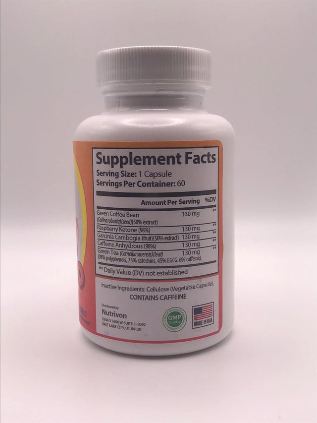 - Ingredients: Raspberry Ketone, Green Tea, Green Coffee Bean, Garcinia Cambogia, Caffeine