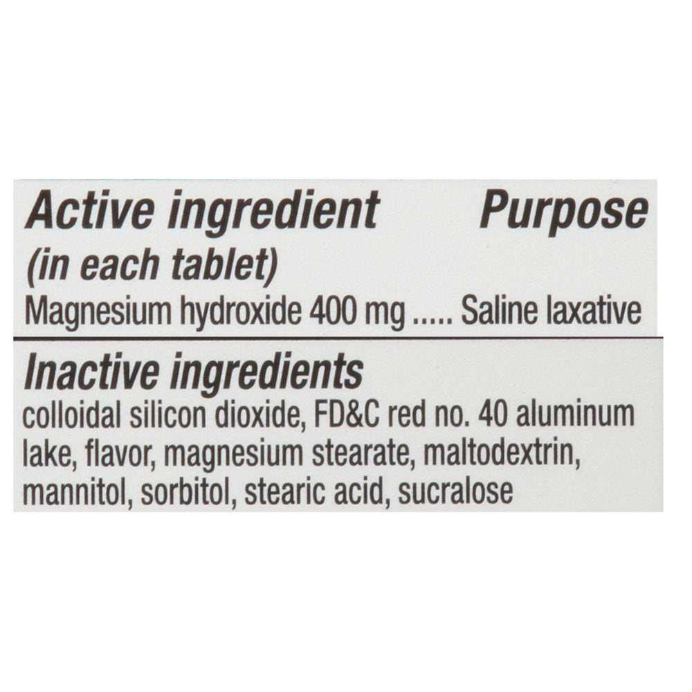 - Easy-to-take watermelon flavored chewable tablets contain magnesium hydroxide, a saline laxative that offers gentle, stimulate-free relief
