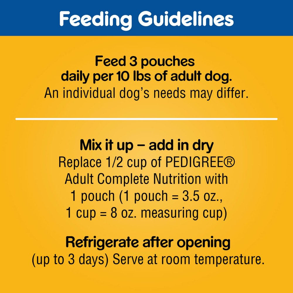 Pedigree Choice Cuts Gravy Wet Dog Food Variety Pack, Every dog deserves to eat well. That's why there's PEDIGREE Choice Cuts Variety Pack Featuring Grilled Chicken Flavor in Sauce, Beef, Noodles, and Vegetables in Sauce, and Chicken Casserole in Gravy Wet Dog Food. Made with real meat soaked in delicious gravy, your canine companion will enjoy these PEDIGREE Recipes as a treat, topper, or complete meal; serve alone or mix into their kibble for added flavor. PEDIGREE Wet Dog Food is also made with optimal levels of oil and minerals to promote healthy skin and a shiny coat. So whether you're looking for a meaty recipe your dog will love, or a fast, easy, and convenient way to serve their favorite meal, PEDIGREE Dog Food Pouches will make their tail wag every time.