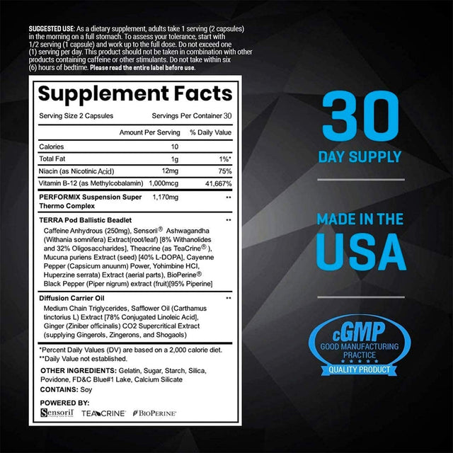 - SST Thermogenic: The Suspension Super Thermo Complex in PERFORMIX SST features Terra Pod Ballistic Beadlets that are packed with powerful ingredients including Caffeine, and TeaCrine to stimulate thermogenesis, creating and supporting Energy for the entire body. It doesn't just help you crush your physical goals, it also supports your mental drive throughout the day. Caffeine, Ashwagandha, and Huperzine work together to promote positive mood, alertness, and mental focus.