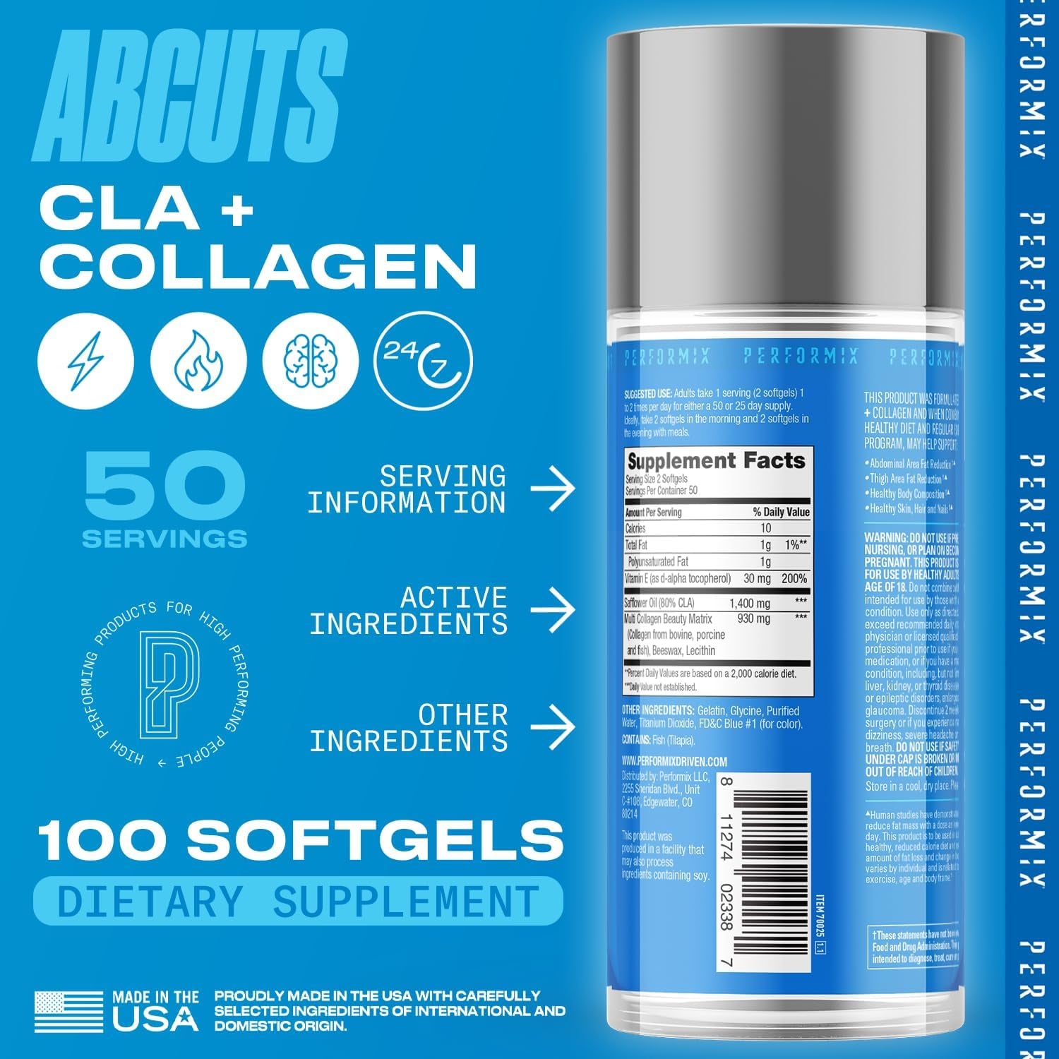 PERFORMIX - Abcuts CLA + Collagen - Fitness Goals - Improve Energy & Endurance - Build Muscle - Hair & Nail Growth - Skin Care - Wellness - Collagen Supplements for Women and Men - 100 Softgels