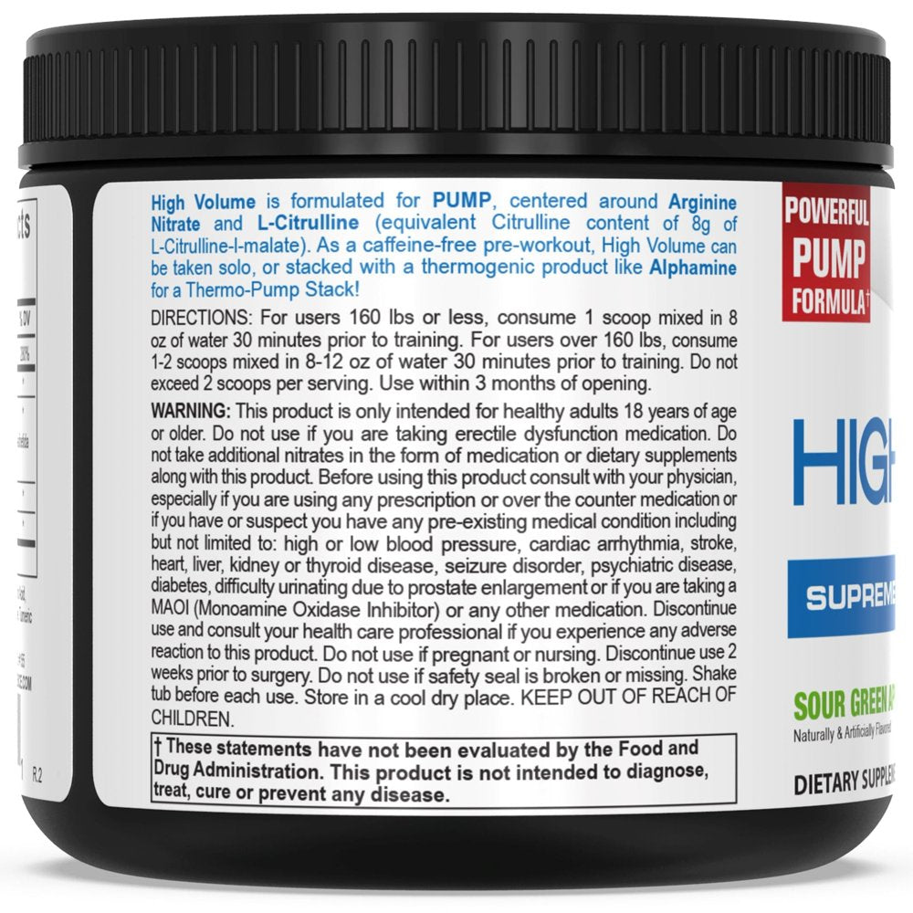 High Volume is perfectly formulated for PUMP, centered around Arginine Nitrate and Citrulline (equivalent Citrulline content of 8g of L-Citrulline-l-malate). As a stimulant-free pre-workout, High Volume can be taken solo, or stacked with a thermogenic product.