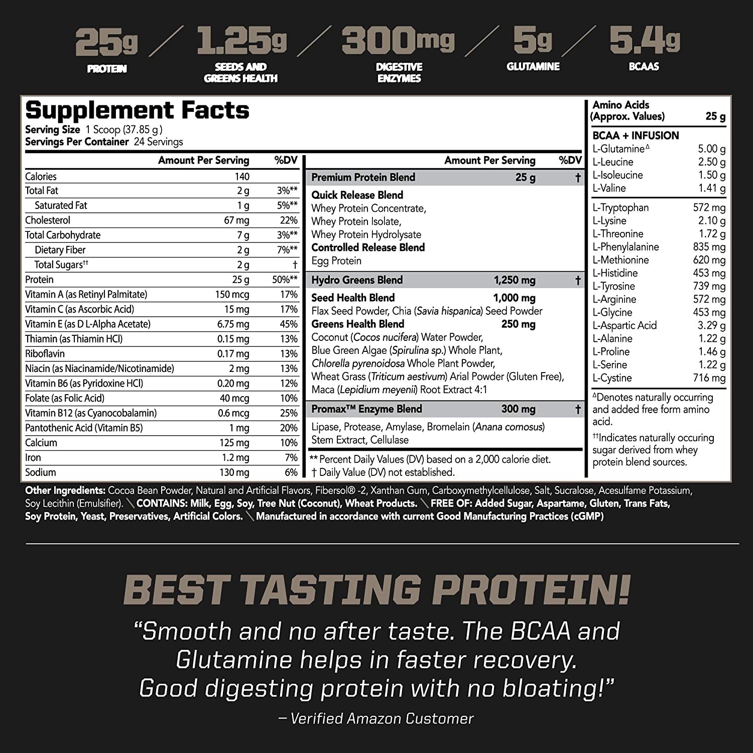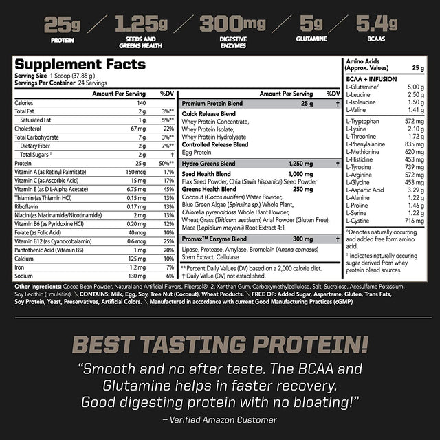 - Superior Quality: Amplify XL is a great tasting protein powder supplement for complete muscle building and recovery. Amplify XL is a precision mix of high-grade protein, glutamine, and branch chain amino acids (BCAAs) designed for complete muscle recovery and repair after workouts and to support overall health. Fortified with digestive enzymes, flax seed powder and supported by a large array of vitamins and minerals from the unique Hydro Greens Blend for overall good health and well being.