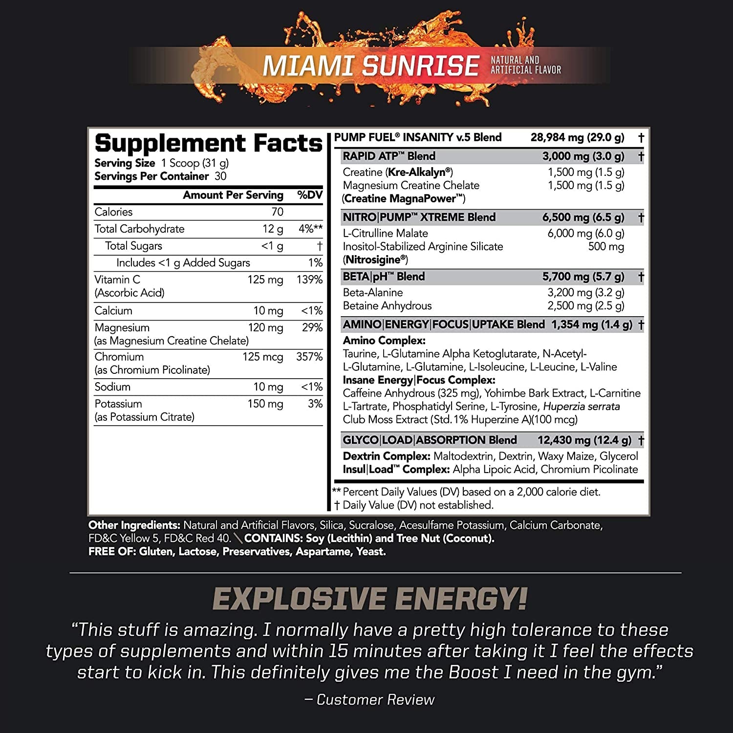Pump Fuel ULTRA INSANITY is a highly advanced pre-workout solution formulated with all the crucial muscle building and performance-enhancing ingredients needed to help you achieve your goals and maximize your results. This premium all-in-one pre-workout formula is completely sync’d and geared up for full throttle workout explosiveness. Pump Fuel ULTRA INSANITY includes the same high-quality foundation of base ingredients that are found in Pump Fuel ULTRA, but INSANITY amps things up a notch with a stronger and more fierce energy factor. If you want that extra edge over your competition, or if you want better results from your workouts, then Pump Fuel ULTRA INSANITY is your answer! With 30 power-packed servings per container, each scoop of Pump Fuel ULTRA INSANITY contains the clinically studied and truth-in-labeled ingredients needed for a truly unrivaled experience in the gym, on the field, on the court, or wherever you need to be at your absolute max! With 29 g per serving this fully loaded unmatched pre-workout formula is expertly fueled with the high performance-based ingredients needed to help support maximum muscle power output, incredible muscular strength, and an intense muscle pump like no other! It also provides insanely strong energy levels and the mental concentration or focus to help fuel you through those body-taxing training sessions. With its Glyco|Load|Absorption Blend now amped way up, Pump Fuel ULTRA INSANITY helps to deliver a healthy supply of fast and slow carbs for a steadier flow of energy throughout your workouts. This blend also helps to replenish muscle glycogen stores, which supports quicker recovery. Pump Fuel sets the standard and raises the bar for what a complete and premium pre-workout formula should be, so don't be fooled or punk'd by imitators. Where others fall short, Pump Fuel excels to carry you beyond your normal thresholds by enhancing your muscular output and endurance.