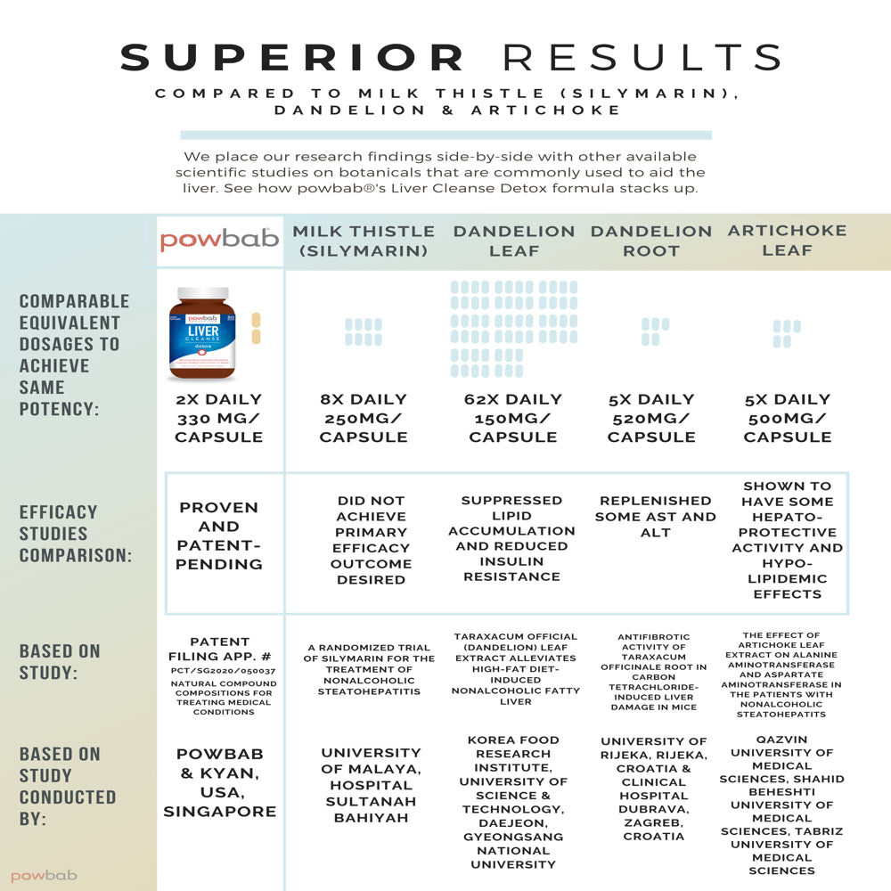 powbab Liver Cleanse Detox is the first Patent-Pending liver detox formula targeting repair and fat metabolism support at the cellular level*. Support healthy liver function protection*. Plus, immune support for a healthy liver*. Detoxification and elimination properties from pure and real ingredients at precise ratios of Organic Baobab Superfruit, Natural Sugar Beet Extract and Goji Extract. Set apart by patent-pending research, demonstrating how our proprietary formula yields more powerful results than milk thistle silymarin, dandelion, or artichoke.* See powbab's Research Here. Increase vitality and energy*. Optimized antioxidants and prebiotic fiber from Organic Baobab. Goji Extract sourced from the pristine Himalayan regions. Plus, European Natural Sugar Beets (beta vulgaris) aid protein synthesis. Take 2 capsules daily. Made in the USA. International Patent App. No. PCT/SG2020/050037. Vegan. Non-GMO. Non-hormonal. No stereates or silicon dioxide.Keep out of reach of children. If you are pregnant, lactating, on medication, or have a medical condition, consult your physician before use.