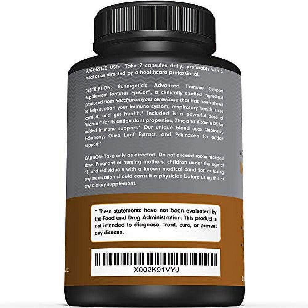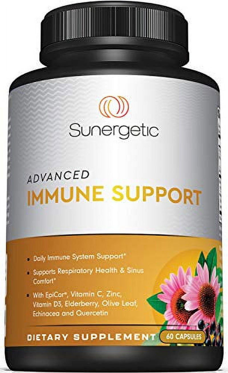 Are you looking for an advanced Immune Support Supplement?There are countless immune support supplements available. But not all immune support vitamins have clinically studied ingredients. Sunergetic?s powerful daily Immune Formula uses clinically studied Epicor, a unique ingredient that is derived through a proprietary process from Saccharomyces cerevisiae. Epicor helps support a healthy immune system, respiratory health, gut health, cellular health and sinus support.No matter the season, Epicor works all year round to support a healthy immune system so you can help feel your best no matter the season. Whether you?re overworked, occasionally stressed or simply looking for a helping hand, you can trust Sunergetic's Immune Support Supplement to help support a healthy immune response and our Immune Support Formula includes ingredients that have antioxidant properties. Our Immune Complex is formulated with world renowned Elderberry Extract, Olive Leaf Extract, Quercetin and Echinacea for added support. Included is Vitamin D3 and Zinc to help support a healthy immune system. Just take two convenient Immune Capsules per day to help support immune system health. Our immune support supplement is made without gluten, soy, dairy and shellfish.Our Immune Support Capsules are manufactured in the USA with globally sourced ingredients in an NSF Certified facility that adheres to Good Manufacturing Practices. Our Immune Support pills are backed by a 365 Day Satisfaction Guarantee because we are confident you will love our Immune Health Supplement!Our Advanced Immune Support Supplement Helps:-Support a healthy immune system*-Support year round respiratory health*-With antioxidant properties*-Support gut health*-Supports overall health and wellness*-Support Sinus and Cellular Health*Click the "Add To Cart" Button above to try our Immune Supplement Today!