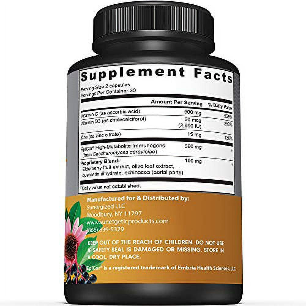 - POWERFUL HERBAL IMMUNE COMPLEX: Sunergetic's Immune Supplement is formulated with Black Elderberry Extract, Quercetin, Echinacea, and Olive Leaf Extract to help support overall wellness. Our immune formula includes a powerful dose of Vitamin D3, Vitamin C, and Zinc to support healthy immune function. These ingredients have antioxidant properties so you can feel your best no matter the season!