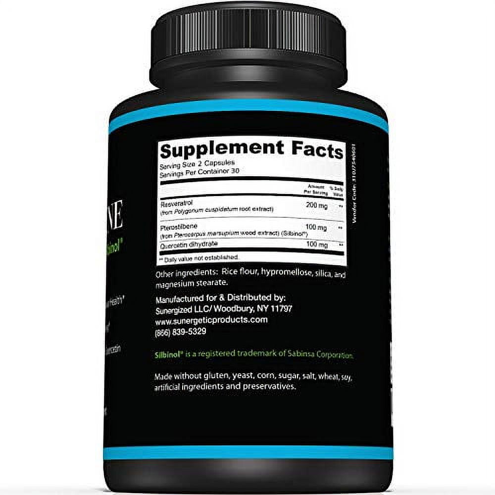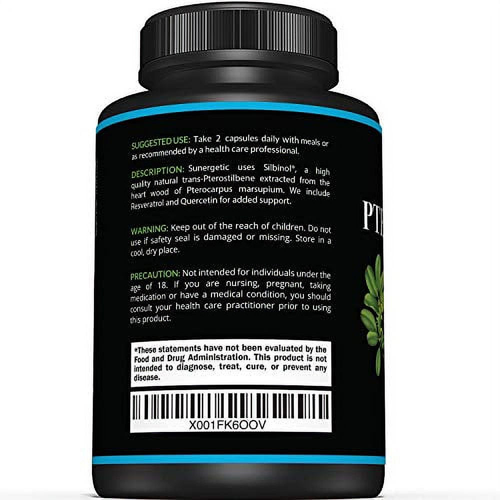 The power of Pterostilbene, Resveratrol and Quercetin!Our natural sourced trans-Pterostilbene (Silbinol) is a standardized extract obtained from the heartwood and bark of the pterocarpus marsupium tree. We combine three powerful ingredients, Pterostilbene, Resveratrol and Quercetin into one capsule. Each capsules contains 50 mg Pterostilbene, 100 mg Resveratrol and 50 mg Quercetin! We recommend two easy to swallow capsules of our vegetarian Pterostilbene Supplement per day. Unlike some other pterostilbene supplements or pterostilbene powder, our formula also includes Resveratrol and Quercetin. Feel the difference today.Why Buy From Us?Sunergetic's Pterostilbene Resveratrol Quercetin Supplement is manufactured in an FDA registered facility that adheres to Good Manufacturing Practices (GMP). Sunergetic Products offer a no questions asked 365 Day 100% money back guarantee because we are very confident you will love our Pterostilbene Formula.Click the "Add To Cart" Button above to try our Pterostilbene Supplement today!