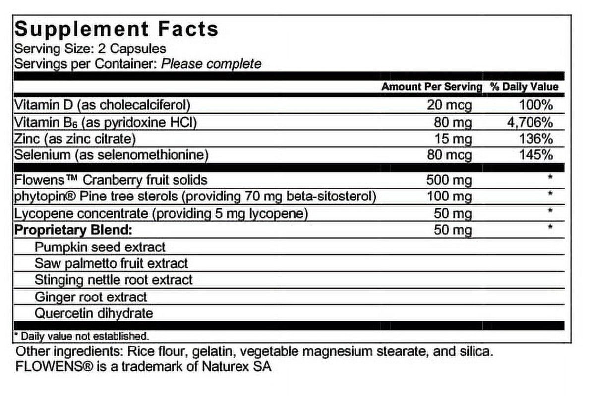 - PREMIUM, CLINICALLY STUDIED INGREDIENTS FOR OPTIMAL PROSTATE SUPPORT: Now with Flowens—100% all natural cranberry powder with gold standard clinical evidence improving urinary tract symptoms. Also includes Saw Palmetto, Beta-Sitosterol, Pumpkin Seed and Quercetin, Stinging Nettle Root, Lycopene, Zinc, Ginger Root, Vitamin D, Vitamin B6, Pumpkin Seed & Selenium. These clinically-studied ingredients help to support prostate health all around the clock.