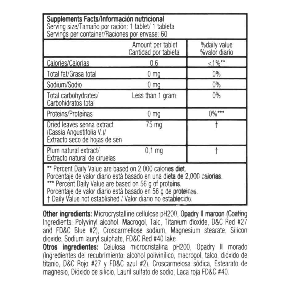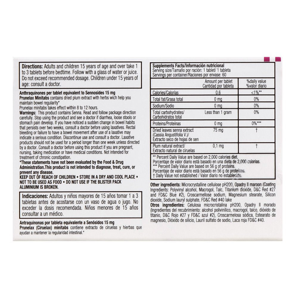 Laxative made of natural Senna leaves; contains 60 tablets Works in just 8 to 12 hours Each tablet contains 15 mg of sennosides B For quick and effective relief adults and children 15 years of age and over take 1 to 3 tablets before bedtime; follow with a glass of water or juice. It gently and effectively relieves constipation during the night. Prunelax don´t lead to dependence. In order to treat occasional constipation, Prunelax can be used for up to 7 consecutive days. Sennosides B is a natural laxative of plant origin, used to treat mild constipation caused by poor eating habits, lack of exercise, and inadequate consumption of natural fiber.