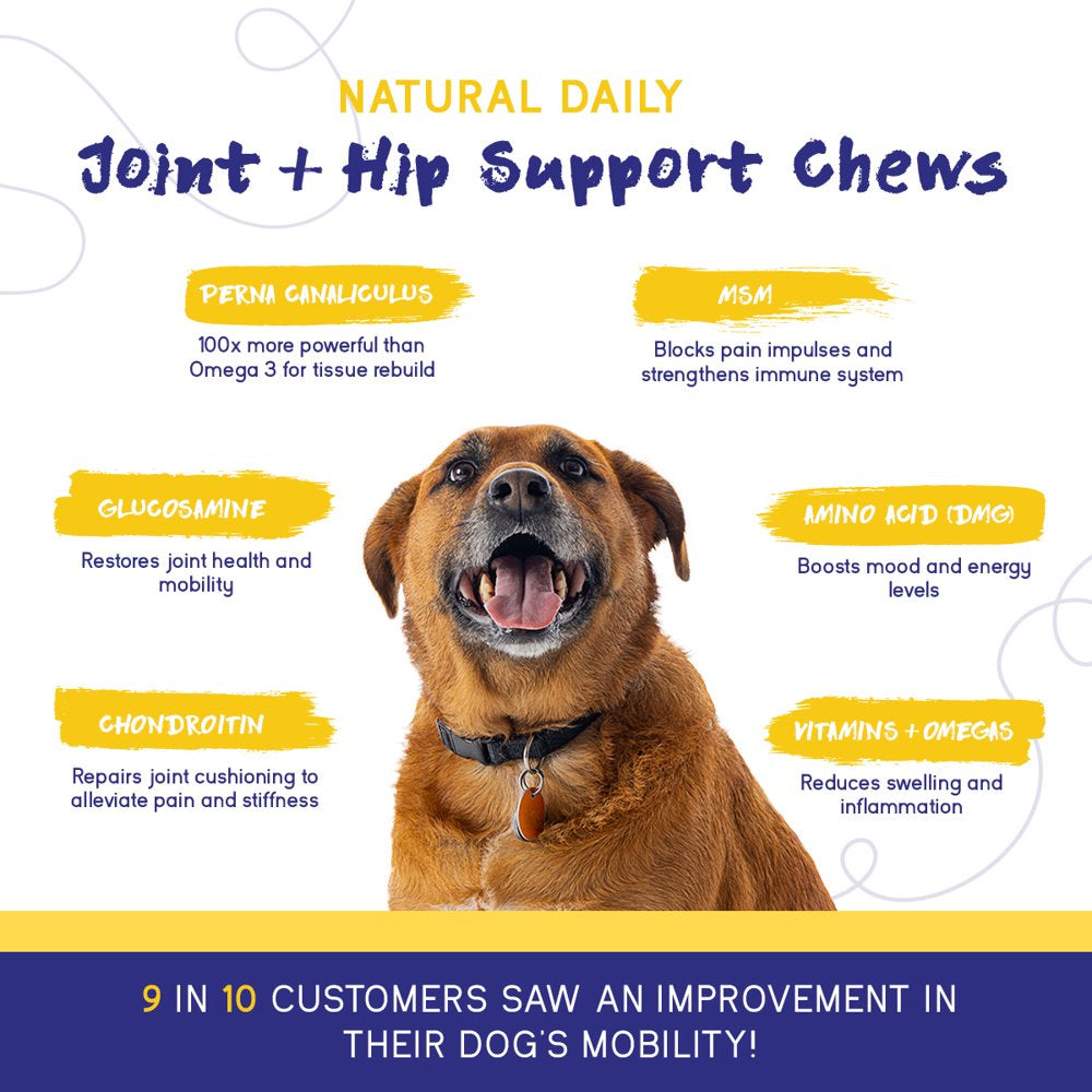 - 9 IN 10 SAW AN IMPROVEMENT IN THEIR DOG'S MOBILITY - Unlike other joint supplements, our unique blend has been proven to improve mobility in just four weeks! Our powerful blend of ingredients helps to cushion joints and promote cartilage to rebuild and alleviate discomfort. Just take it from our customers—9 out of 10 surveyed customers saw an overall improvement in their dog's mobility.