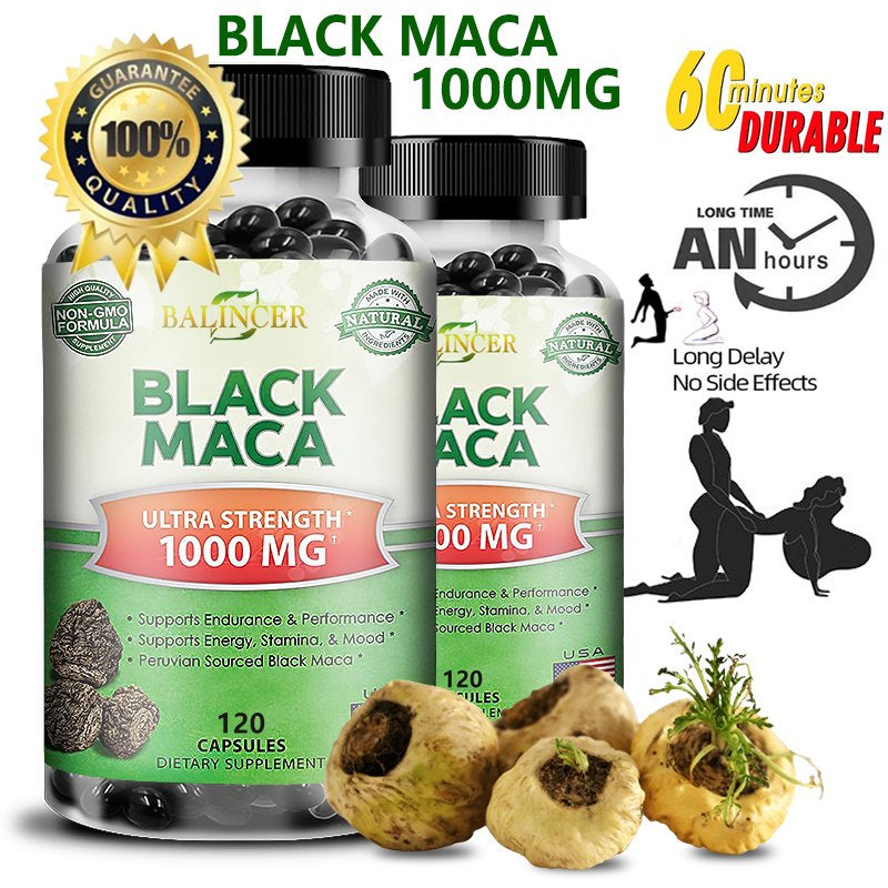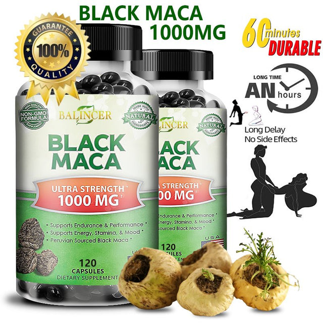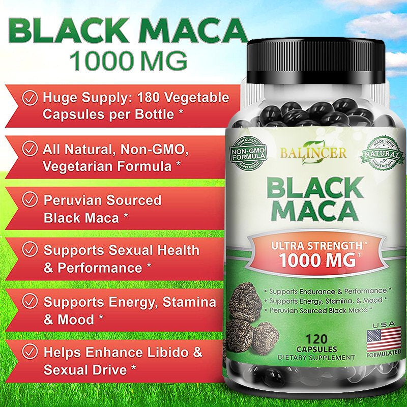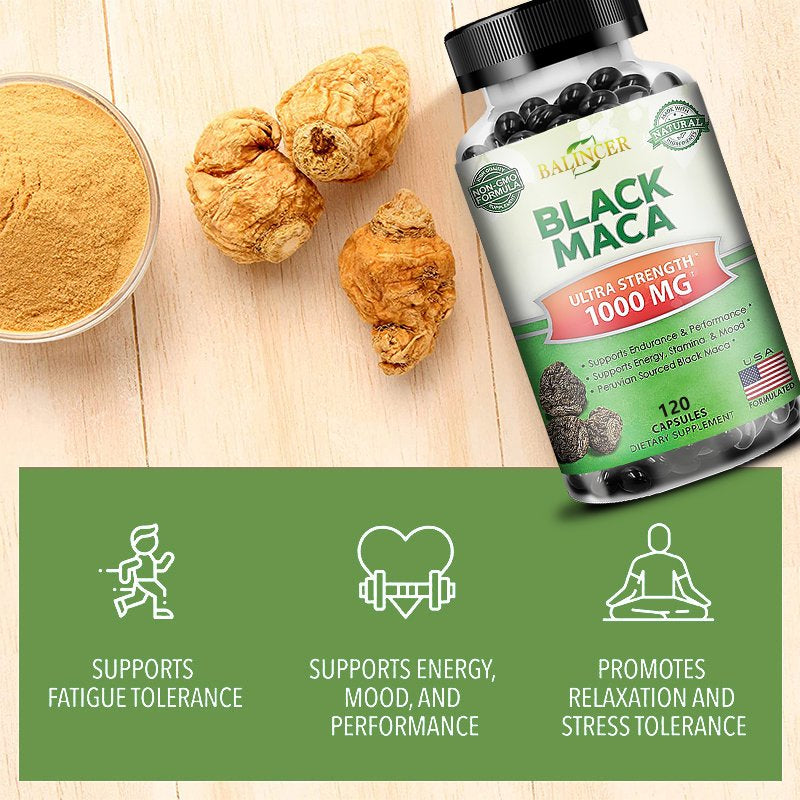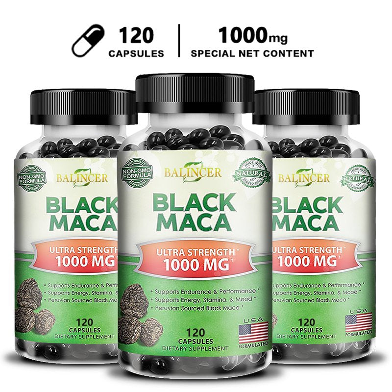 MAX STRENGTH BLACK MACA: BALINCER maximum strength Black Maca root extract supplement contains 1000mg of Peruvian sourced Gelatinized Black Maca per serving. Black Maca (Lepidium Meyenii) is an herb native to the Andes Mountains in Peru. BLACK MACA - THE SUPERIOR MACA: Peruvian sourced Black Maca has many benefits that make it a superior choice for men, as opposed to red or yellow maca extract / powder. Additionally, Black Maca supports muscle building and athletic performance, may help with natural testosterone production, is a good source of protein, and helps balance your mood. LOOK FOR GELATINIZED: Our potent extract formula contains 500mg of Peruvian sourced Gelatinized Black Maca per capsule, and 1000 MG per serving (2 capsules per serving). Gelatinized Black Maca is superior because it utilizes a boiling process to remove starch content, and is therefore typically easier to digest. Additionally, Gelatinized Black Maca contains more concentrated nutrient content, and amplified metabolites & minerals.