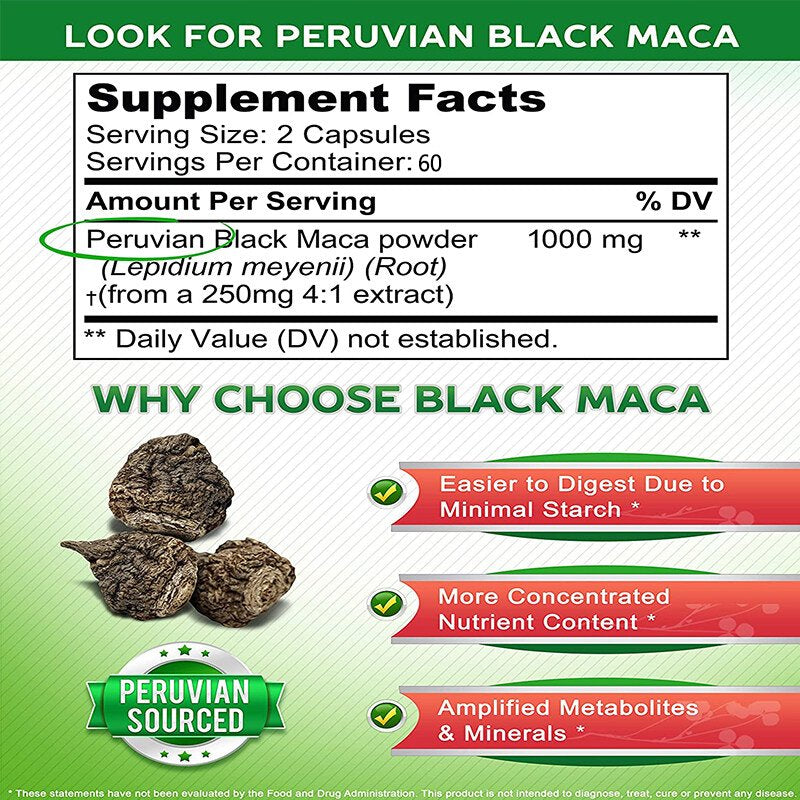 | Product Name | Pure Black Maca Root - Max Strength 1000mg Per Serving - Gelatinized Maca Root Extract Supplement from Peru - Natural Pills to Support Reproductive Health & Energy - Non-GMO-120capsules |