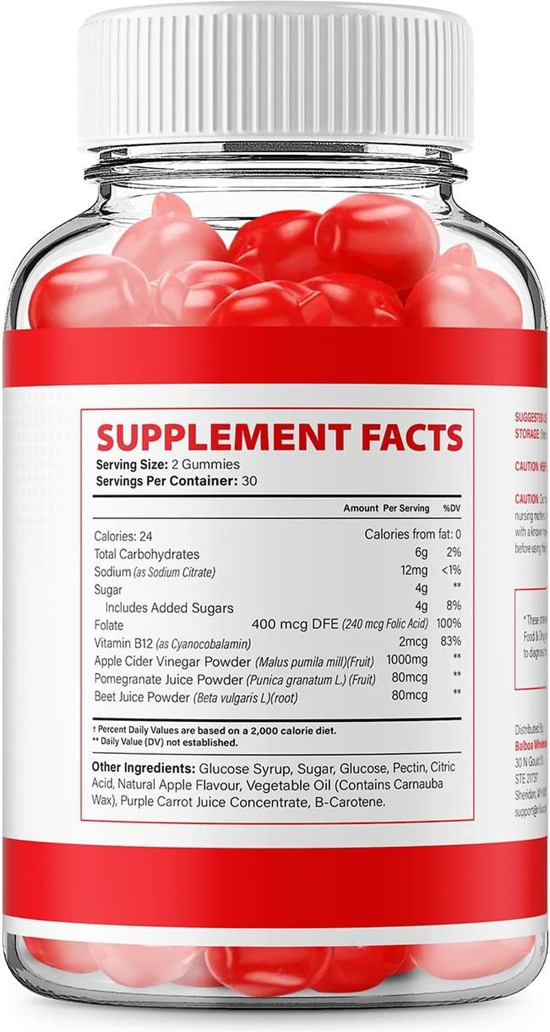 Ingredients:Apple Cider Vinegar, Beet Juice, Beet Root, Pectin, Citric Acid, Folic Acid, Pomegranate, Vitamin B12, Sodium Citrate, Glucose, Sugar, Glucose Syrup, Natural Apple Flavor, Vegetable Oil, Carrot Concentrate, Beta Carotene, Carnuba Wax
