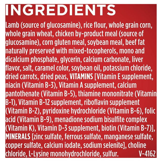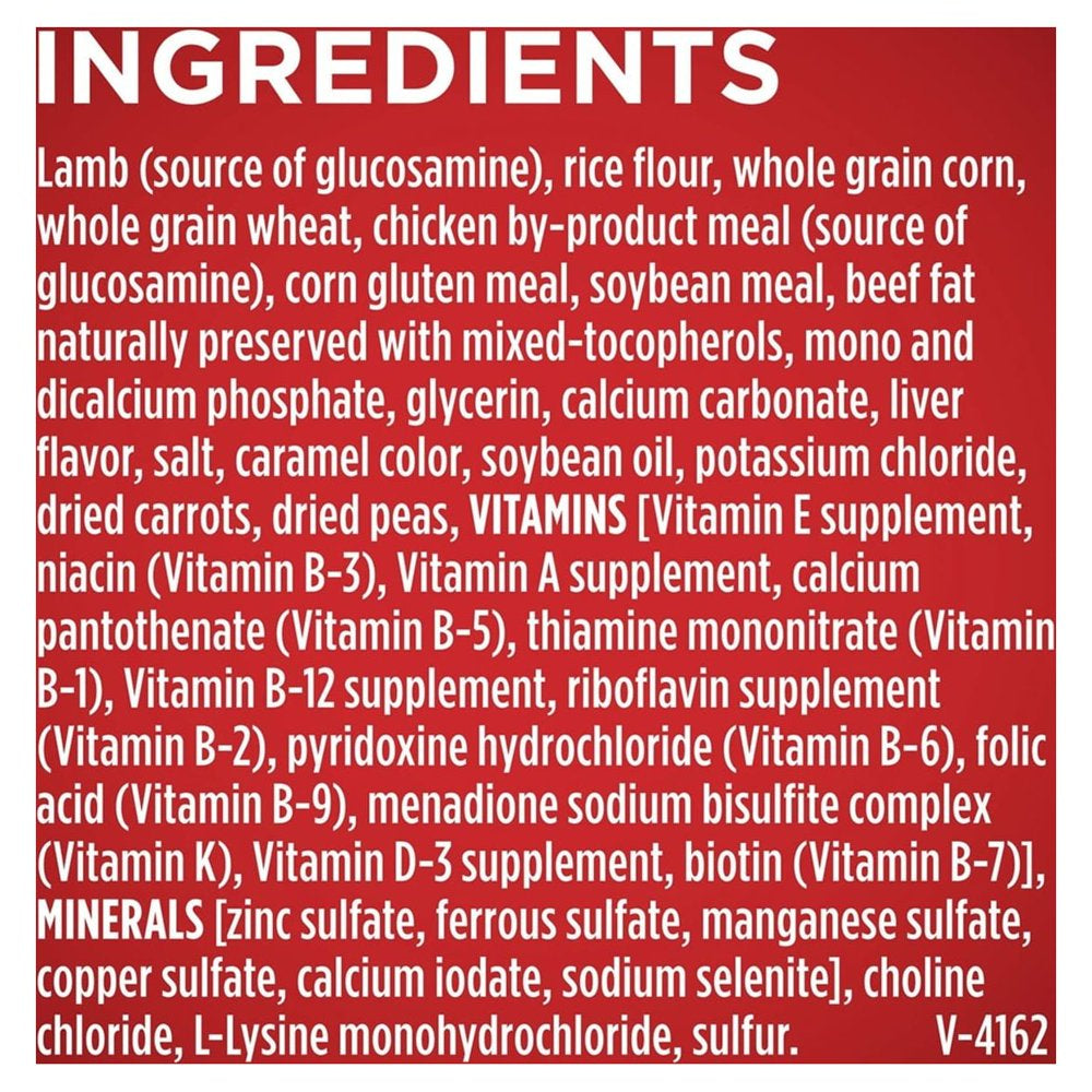Lamb (source of glucosamine) brewer's rice whole grain corn whole grain wheat poultry by-product meal (source of glucosamine) corn gluten meal soybean meal animal fat preserved with mixed-tocopherols calcium phosphate glycerin animal digest calcium carbonate potassium chloride salt caramel color Vitamin E supplement choline chloride zinc sulfate L-Lysine monohydrochloride ferrous sulfate sulfur manganese sulfate niacin Vitamin A supplement calcium pantothenate thiamine mononitrate copper sulfate riboflavin supplement Vitamin B-12 supplement pyridoxine hydrochloride garlic oil folic acid Vitamin D-3 supplement calcium iodate biotin menadione sodium bisulfite complex (source of Vitamin K activity) sodium selenite. U-4162