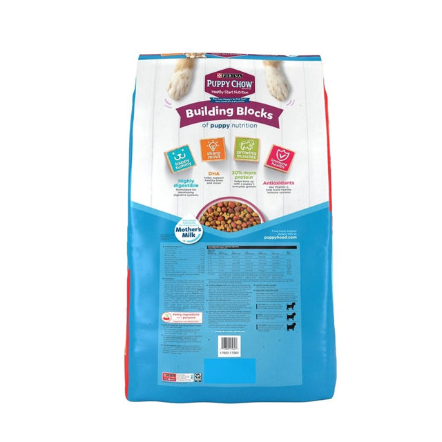 - 36 pounds. Health Start Nutrition: For your puppy�s 1st full year (Up to 2 years for large breed puppies). 100% complete balanced. Building Blocks of puppy nutrition: Happy tummy: Highly digestible formulated for developing digestive systems. Sharp Mind DHA helps support healthy drain and vision. Growing muscles: 30% more protein (Compared to leading adult dog food) helps keep up with a puppy�s everyday growth. Immune health: Antioxidants like vitamin C help build healthy immune systems. Essential nutrients like those found in Mother�s Milk. With tender meaty pieces. Healthy start nutrition. Building Blocks of puppy nutrition. Growing muscles, happy tummy, sharp mind, immune health. Essential nutrients like those found in Mother's milk. Complete nutrition. Smart Value. The Purina Promise: pets are our passion. Safety is our promise. Progress is our pledge. Follow us at purina.com. We're listening. Visit us online at purina.com or call 1-800-7PURINA (1-800-778-7462). Purina.com. how2recycle.info. puppychow.com/ingredients. puppyhood.com. Twitter. Facebook. Find more helpful puppy info at puppyhood.com. Every ingredient has a purpose puppychow.com/ingredients. New Zealand: 0800 PET VIP (0800 738 847). Printed in USA. Crafted in USA facilities. Printed in USA.