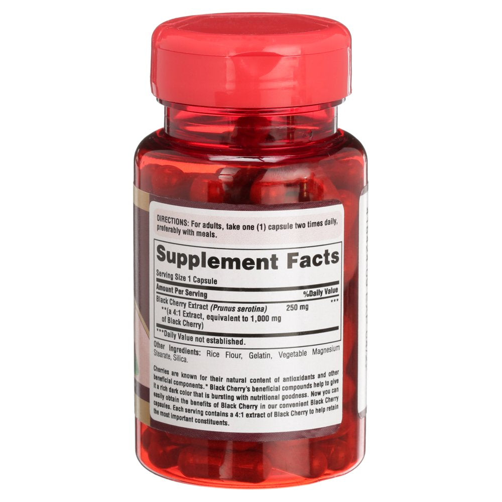 Cherries are a staple of summer, found in pies and preserves. These juicy and tart stone fruits have a short season, but they are bursting with nutritional goodness that's beneficial all year round. Put simply, Black Cherry is a supplement that promotes overall health and wellness. Black cherries, also known as wild cherries, are commonly found in North America, South America and Western Europe. They are darker in color than bright red Bing cherries, and are rich in antioxidants, which help protect cells from oxidative damage. Cherries contain a naturally occurring antioxidant called chlorogenic acid that contributes to cellular health.Each serving of Puritan Pride's Black Cherry capsules contains a 4:1 extract of black cherry, making it a highly concentrated form that helps retain the most important constituents.