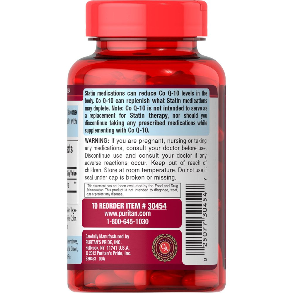 Coenzyme Q-10 (Co Q-10) is a key antioxidant that has a big job: supporting you as you age gracefully. It plays numerous roles within the body such as supporting energy production and fighting off cell-damaging free radicals which is what makes Co Q-10 an important compound in your body. Co Q-10 contributes to cardiovascular wellness and energy production within your heart. If you're looking to support a healthy heart and blood-pressure levels that are already within a normal range, Co Q-10 does just that. It also promotes oral and gum health, which is also good for the heart. Puritan's Pride's own Q-SORB Co Q-10 is a natural, highly bioavailable form of Co Q-10, and it's ingredients sourced from around the world. Co Q-10 levels within cells may decline with age. They may also be reduced in those who take statin medications, which are often prescribed for high cholesterol. Q-SORB Co Q-10 can help replenish what statin medications deplete. Co Q-10 is not intended to serve as a replacement for statin therapy, nor should you discontinue taking any prescribed medications while supplementing with Co Q-10.