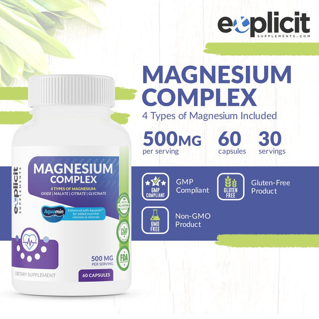 Quad Magnesium Complex Supplement - 500Mg of Magnesium Glycinate, Malate, Oxide & Citrate for Support of Muscles, Sleep, Energy & Relaxation - High Absorption with Aquamin - 60 Capsules