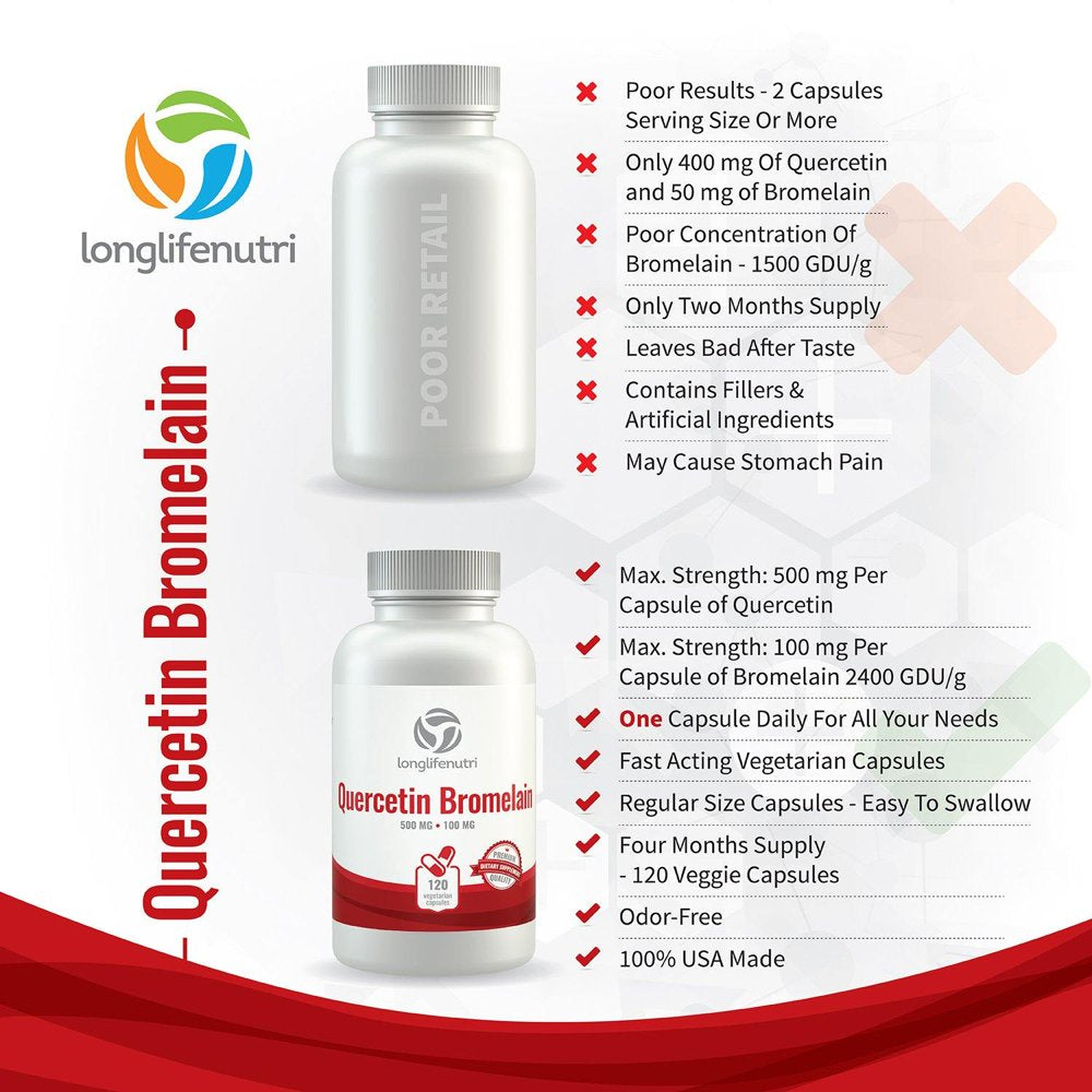 Premium Quality, Potency and Pure Quercetin Bromelein Non Gmo and Soy Free - Our supplement has an ultra potent combination of Quercitin as Quercetina Dihydrate - 500mg and Bromalein 2400 Gdu / g - 100 mg per vegan caps. Our product s pass through researches to verify procedure for you get the safest and purest product. Made in USA with veggie caps Vcap - Our products are made according to strict Gmp standards., Benefits of Quercetin Bromelain: This combination is a great way to get maximum benefits as they increase each others action. Bromelin is a proteolytic enzyme purified from pineapple. Quecertin is a naturally occurring bioflavonoid that supports healthy histamine levels. This combination may also provide numerous other benefits., Perfetc Recommended Dosage: Just one serving per day of our pure all natural mega activated Querticin Bromalain veg caps delivers the highest recommended dose amount with the best ingredients. Receive a full 120 Vcaps - 4 months supply - Daily use. Easy to Swallow: Our tabs are easy to swallow without stomach issues. We manufacture only top rated formulas chewable multi vits drops raw materials and herbs extract for men women children toddler., Limited Time Pill Case - If you buy today our Quercertin Bromeline you'll get a LongLifeNutri Pill Case keeping tablets softgels gummies chews fresh, secure & organized. Take advantage of this super deal now., Backed by LongLifeNutri Lifetime Money-back : We only develop products that were carefully tested - Buy the best with confidence - Love our bottle of Quertin w Bromelian or get every penny back, no questions asked, it's that easy.