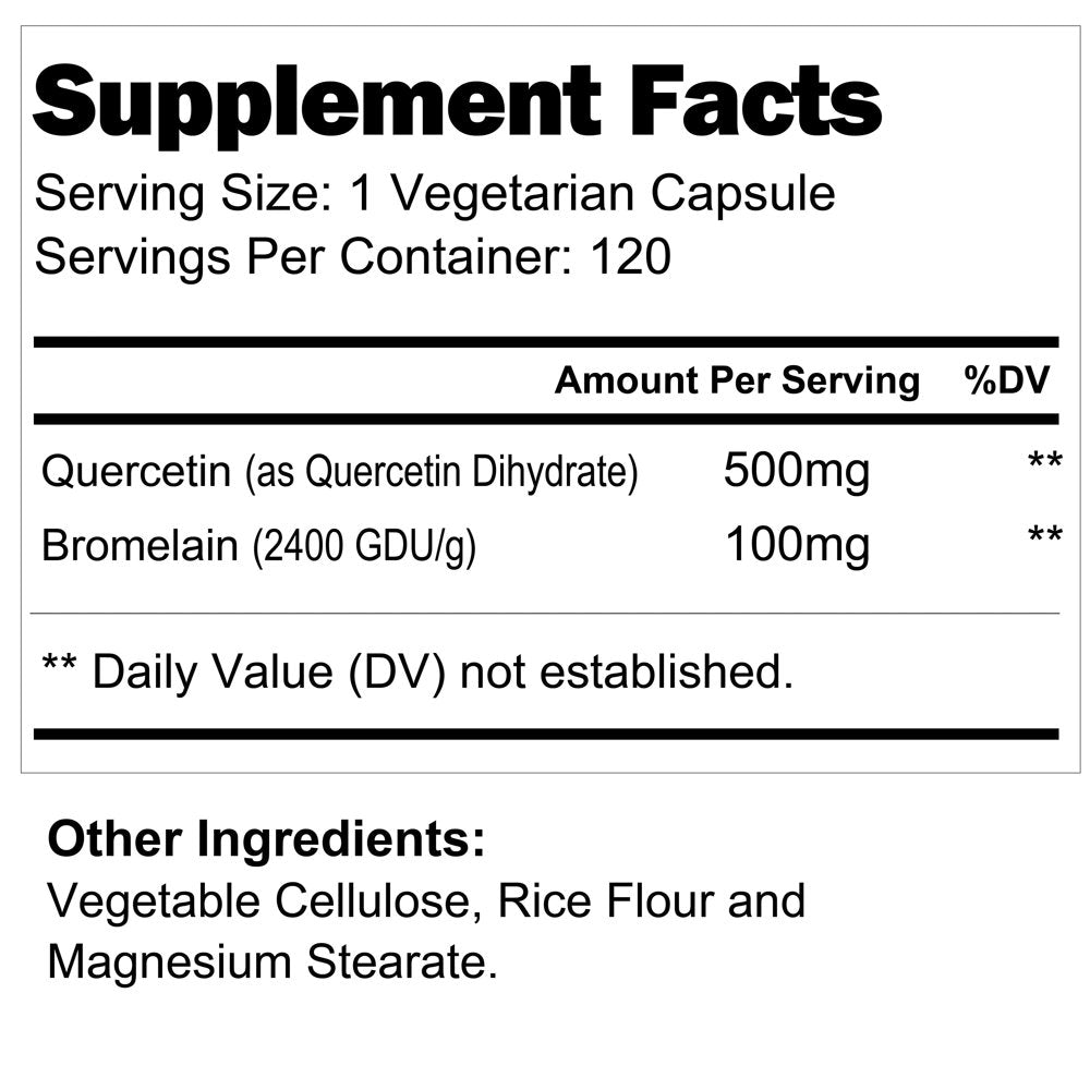 LongLifeNutri Quercetin with Bromelain - The Best you can get! Extra Strength Potency & High Purity A healthy body needs a max formula of Quercitin Bromelein because Quecertin bioflavonoid works on an all natural antioxidant level to reduce the damage and irritation caused by free radicals, also stabilizes mast cell membranes preventing the release of histamine while Bromalein works on an enzyme level, limiting the action of metabolites, also has been used in modern medicine. TOP FEATURES: * Made in USA - Vegan * Soy Free - Gluten Free - Non Gmo * Regularly Tested & GMP Standards * Quercerin 500mg & Bromelin 2400GDU Per G - 100mg
