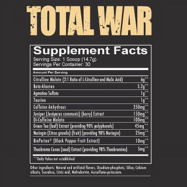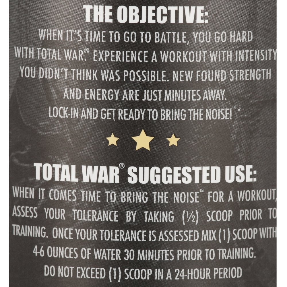 - ALL IN ONE - The powerful combination of stimulants and focus factors along with N.O. compounds makes Total War an all-in-one pre workout supplement.* Enjoy the most energy, focus, and skin splitting pumps you’ve ever felt during a workout.