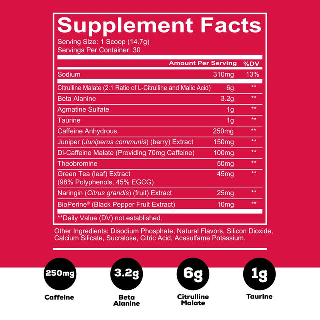 Redcon1 TOTAL WAR professional-grade, award-winning preworkout is formulated with premium ingredients packed with caffeine, green tea, beta-alanine, and Juniper that provides you with the unstoppable power to help you dominate even your most challenging workouts. With 30 clinically dosed servings per container and transparent ingredient labeling, everyone can now have access to an elite level pre workout without breaking their bank or sacrificing for a low-quality ingredient pre workouts.