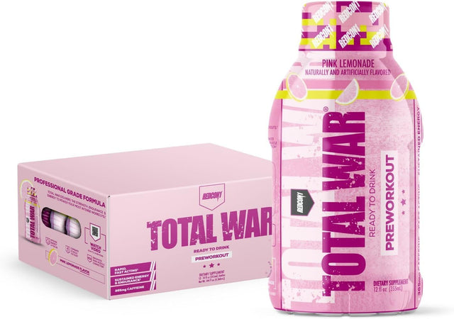 REDCON1 Total War Ready to Drink Preworkout, Pink Lemonade - 350Mg of Fast Acting RTD Caffeine - Beta Alanine + Citrulline Malate for Increased Pump - Keto Friendly Workout Drink (12 Servings)