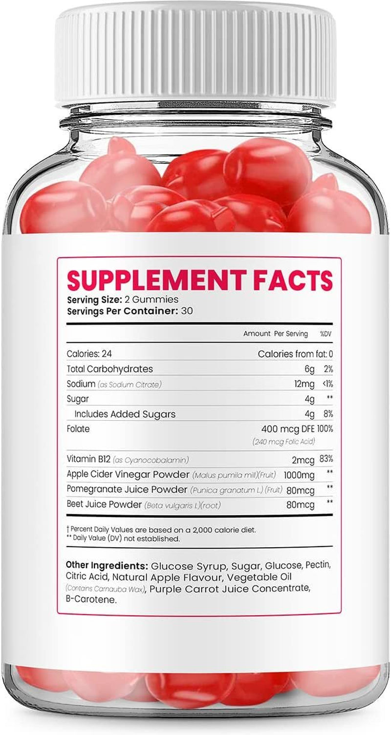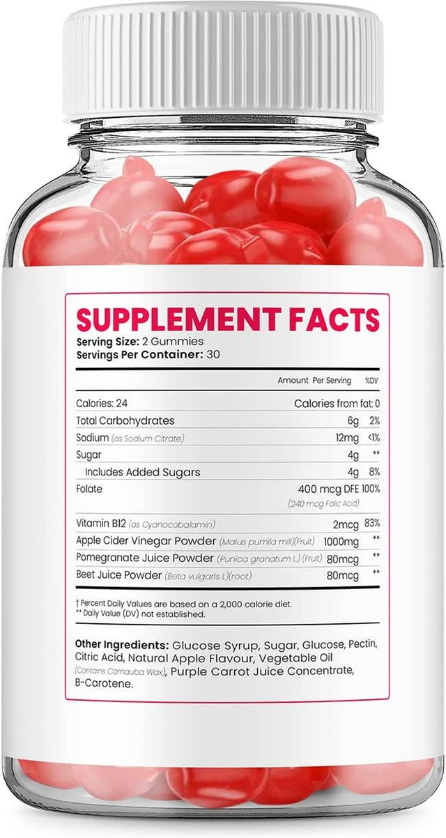 Ingredients: Apple Cider Vinegar, Beet Juice, Beet Root, Pectin, Citric Acid, Folic Acid, Pomegranate, Vitamin B12, Sodium Citrate, Glucose, Sugar, Glucose Syrup, Natural Apple Flavor, Vegetable Oil, Carrot Concentrate, Beta Carotene, Carnuba Wax