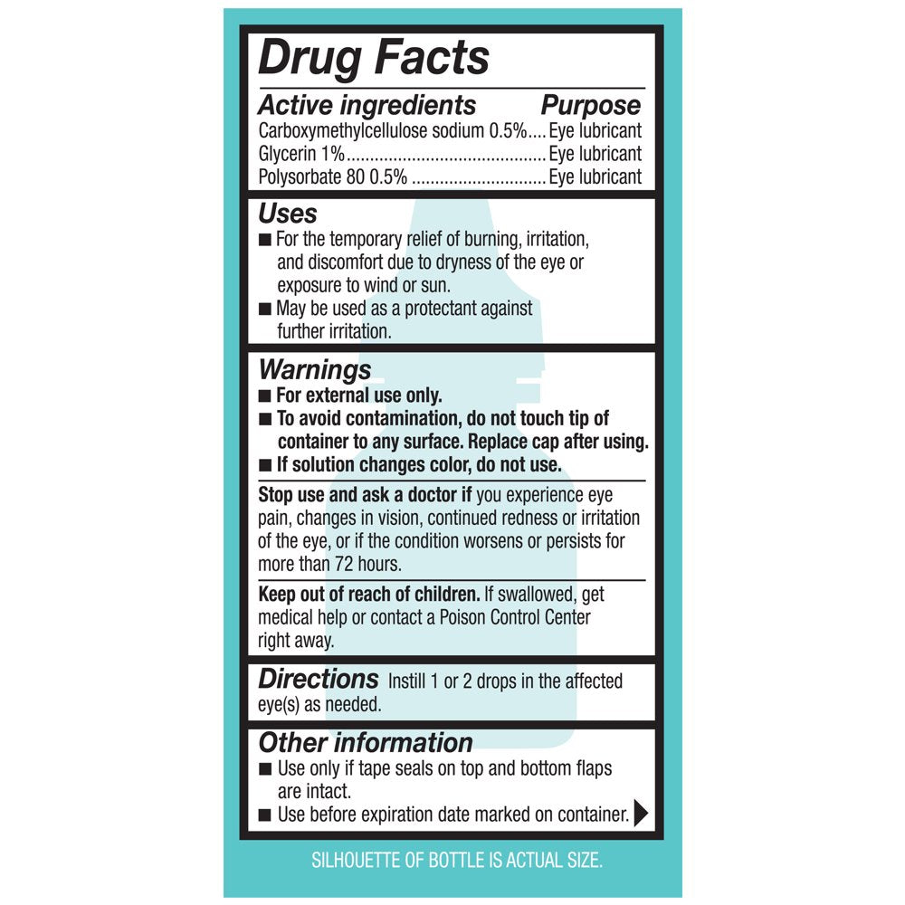 Warnings: For external use only. To avoid contamination, do not touch tip of container to any surface. Replace cap after using. If solution changes color, do not use. Stop use and ask a doctor if you experience eye pain, changes in vision, continued redness or irritation of the eye, or if the condition worsens or persists for more than 72 hours. Keep out of reach of children. If swallowed, get medical help or contact a Poison Control Center right away. Other Information: Use only if tape seals on top and bottom flaps are intact. Use before expiration date marked on container. Discard 90 days after opening. Store at 59°-86°F (15°-30°C).