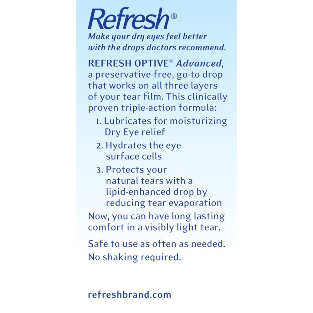REFRESH OPTIVE ADVANCED Lubricant Eye Drops is a preservative-free, triple-action formula that lubricates and hydrates dry, burning, irritated eyes, and helps prevent tears from evaporating. It also features HydroCell technology which enables hydration and maintains the volume of cells on the eye's surface. The result? Triple-action relief dry, sensitive eyes. REFRESH OPTIVE ADVANCED Preservative-Free Lubricant Eye Drops come in sterile, single-use vials you can take with you anywhere. Trust your eyes to REFRESH—The #1 selling brand in preservative-free artificial tears.* (*REFRESH Family of Products, Ipsos Healthcare, 2021 REFRESH ECP Recommendation Survey.)