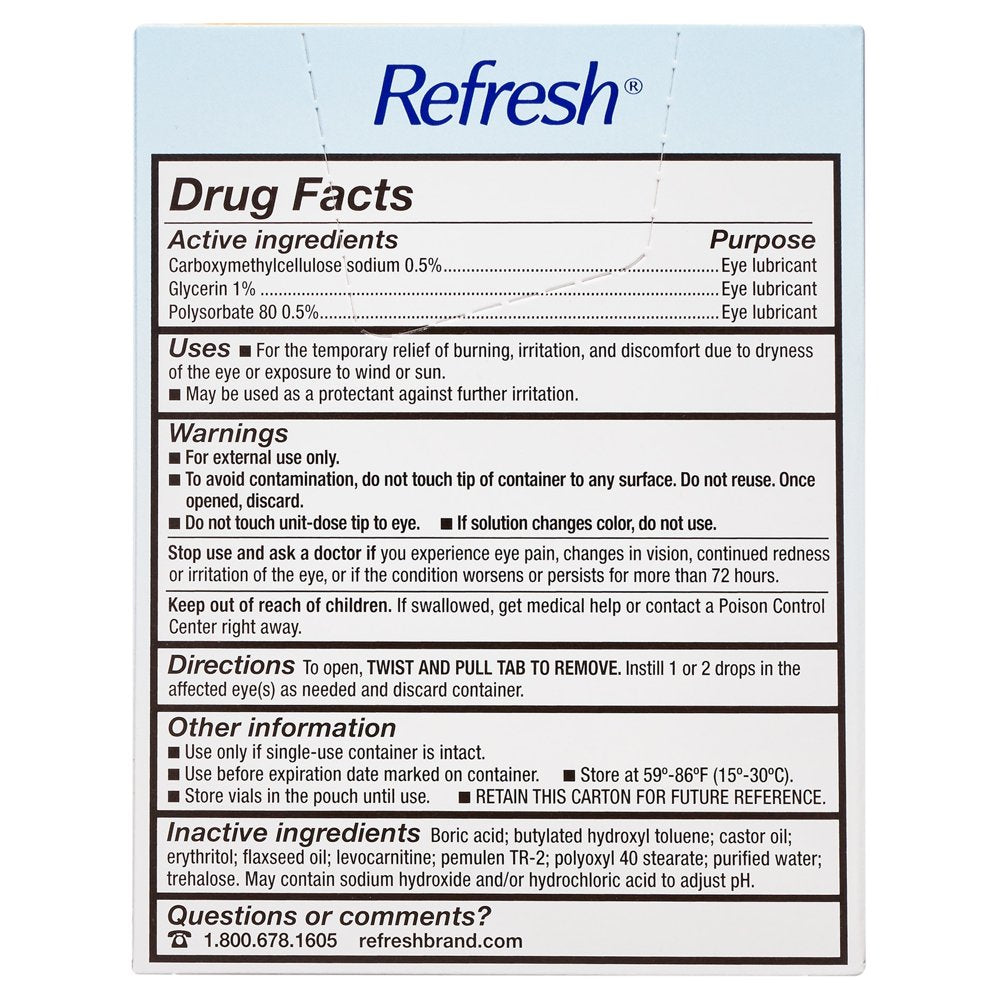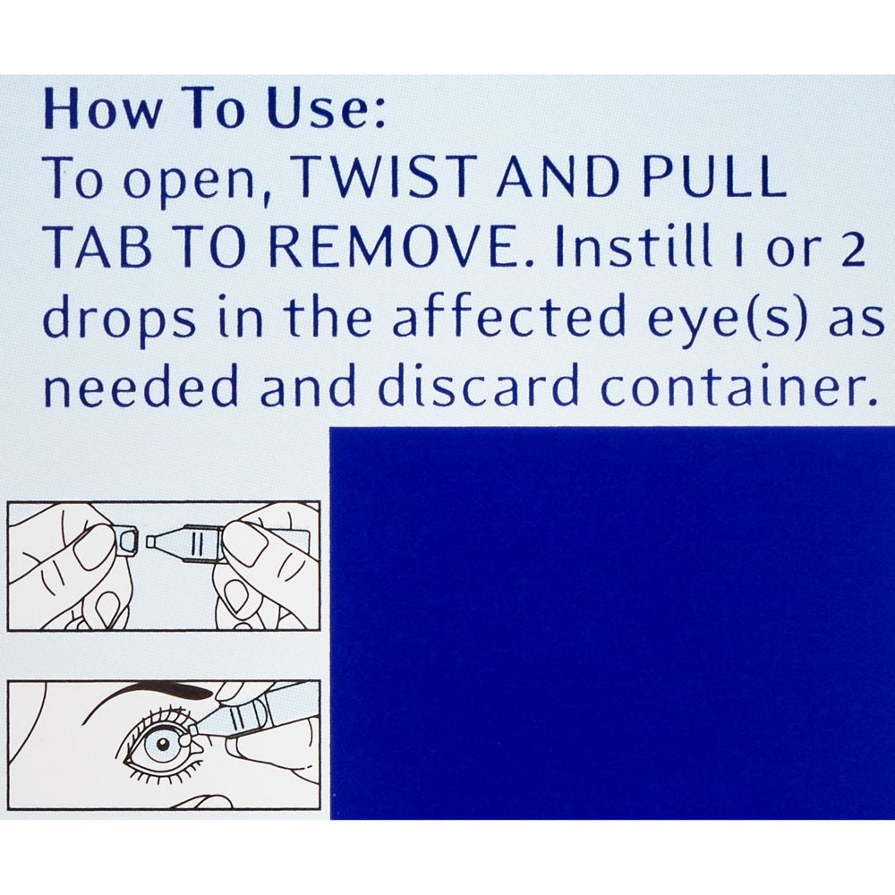 Warnings: For external use only. To avoid contamination, do not touch tip of container to any surface. Do not reuse. Once opened, discard. Do not touch unit-dose tip to eye. If solution changes color, do not use. Stop use and ask a doctor if you experience eye pain, changes in vision, continued redness or irritation of the eye, or if the condition worsens or persists for more than 72 hours. Keep out of reach of children. If swallowed, get medical help or contact a Poison Control Center right away. Other Information: Use only if single-use container is intact. Use before expiration date marked on container. Store at 59°-86°F (15°-30°C). Store vials in the pouch until use.