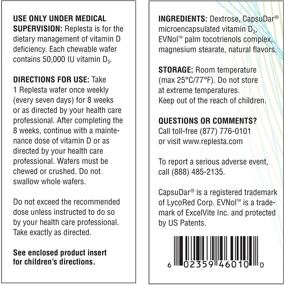 Replesta is a medical food for the dietary management of vitamin D deficiency. Replesta is a delicious, orange flavored chewable wafer that contains 50,000 IU vitamin D3 – as recommended by experts to manage vitamin D deficiency. Based on the recommendations from your health care professional, Replesta can be taken weekly, semimonthly or monthly to manage vitamin D deficiency. Use only under medical supervision.