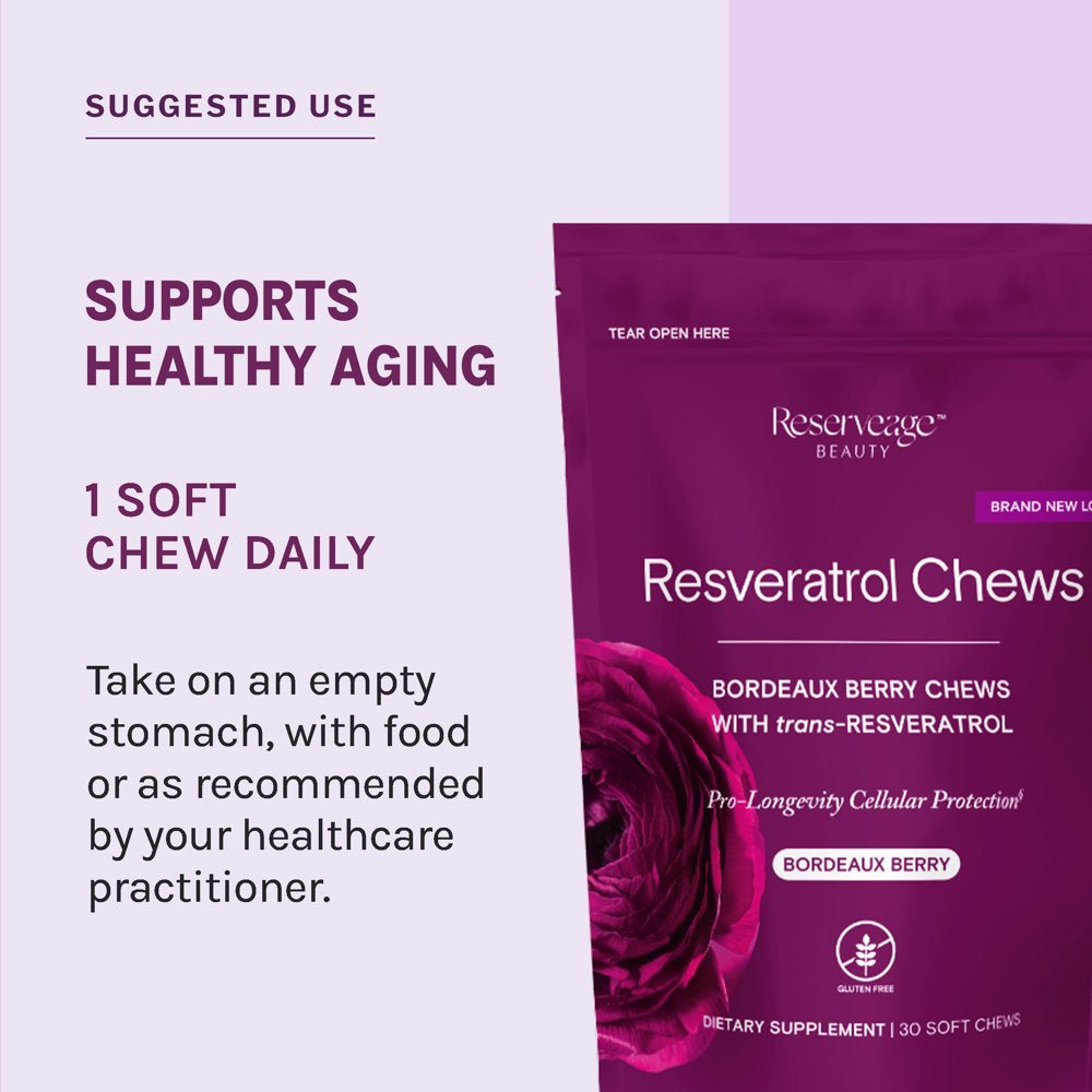 - The Benefits You Love: Reserveage Nutrition's Reseveratrol Chews offer the benefits of Resveratrol in a convient chew.