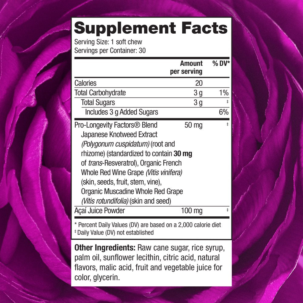 Reserveage Nutrition's Resveratrol Chews delivers antioxidant protection in our proprietary blend that combines the finest wildcrafted Japanese Knotweed Extract (Polygonum cuspidatum) combined with organic French red wine grapes and organic Muscatine grapes.