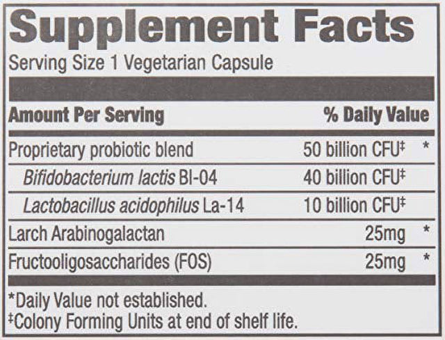 - 50 billion CFU probiotic blend per capsule (40 billion CFU Bifidobacterium lactis BI-04 and 10 billion CFU Lactobacillus acidophilus La-14) with 50mg prebiotic blend
