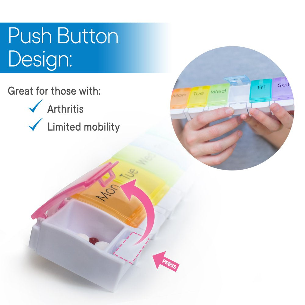 - UNIQUE DESIGN, EASY TO USE: Unlike traditional medicine reminders, RMS Pill Case is designed to use a unique "Push Button" to open and lock the compartment with ease. It’s great for those with weak finger strength, arthritis, or poor dexterity. The push button stays closed once locked and securely snaps shut keeping pills safe.