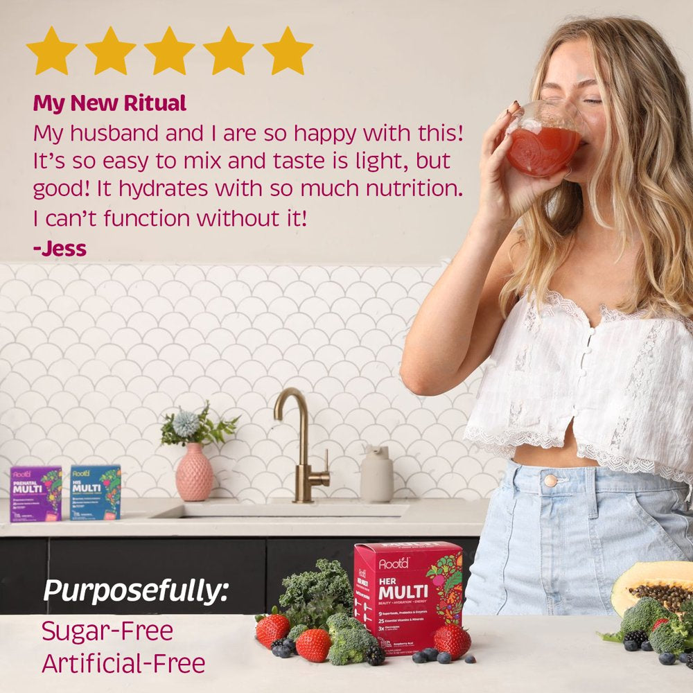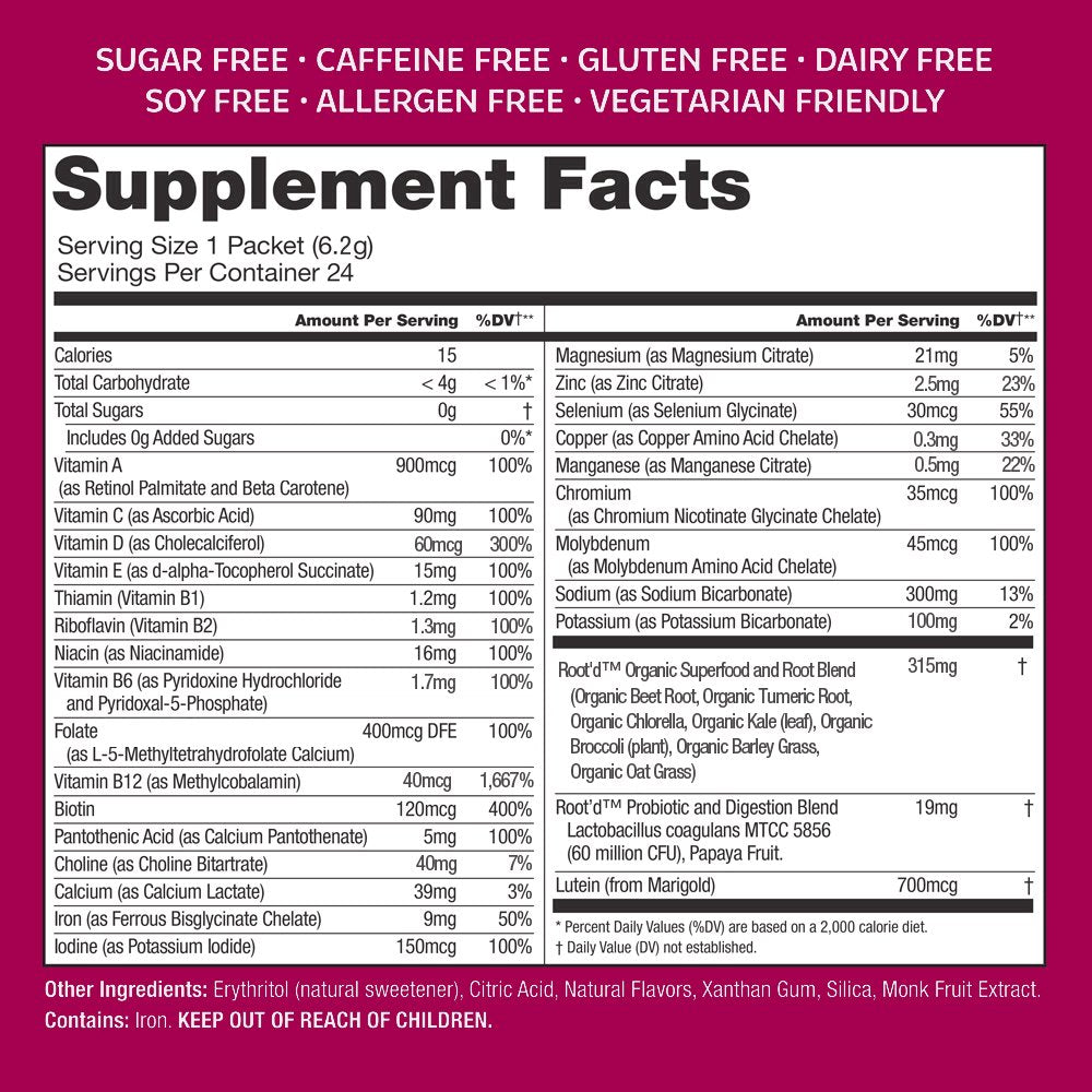 ✅ YES - While traditional "multivitamins" give you only a handful of nutrients, Root’d BOOSTS your daily routine by infusing the 25 essential vitamins & minerals a woman's body needs every day with digestive probiotics, energizing organic superfoods beets, turmeric, & greens, PLUS electrolytes for hydration all into one ahh'mazing drink mix.