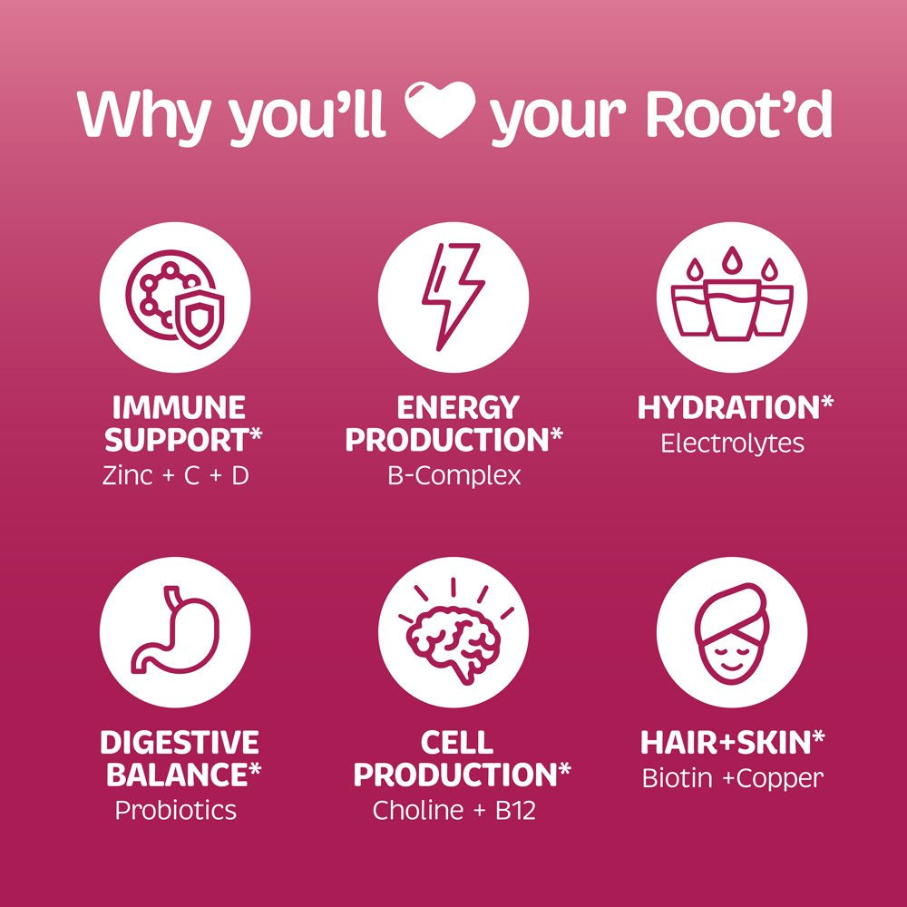 Upgrade your nutrition, and give your body the essential multivitamins it needs daily, plus electrolytes to rehydrate. Our multivitamin blend is specially formulated for women's health. With added superfoods probiotics and enzymes, the proven nutrients in Root'd digest with the natural flow of your body, helping to keep you at your best you! Hack your health with Root'd for her