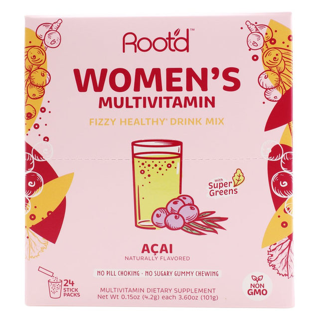 Root'd - Women's Multivitamin Fizzy Healthy Drink Mix Acai - 24 Stick Packs (0.15 oz. / 4.2 g each) Root'd is a super greens infused full spectrum women's multivitamin drink mix.